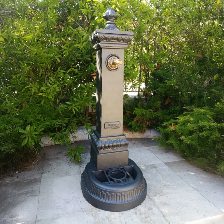 Fontana a colonna in ghisa verniciata con fondo ai fosfati e finitura grigio antracite, senza rubinetto.