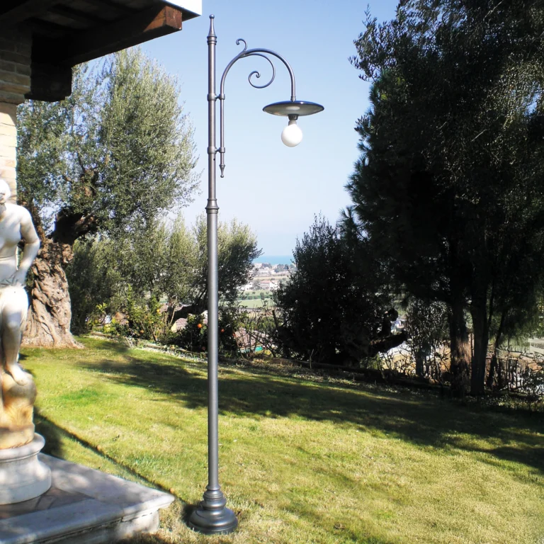 Lampione ad un braccio, completo di globo in acrilico bianco e portalampada.