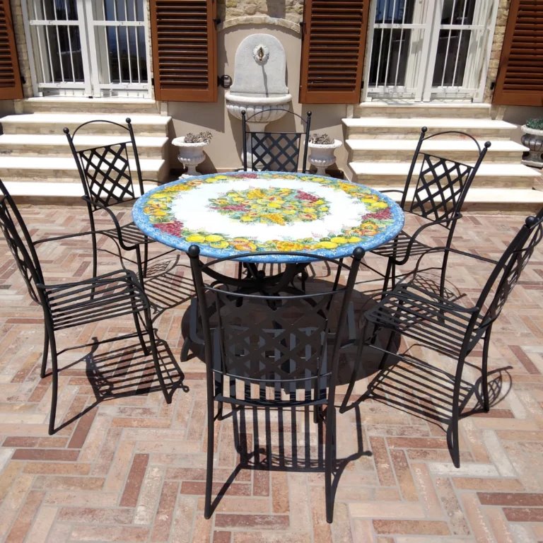 Composto da 2 poltrone , un divano a due posti e tavolino in ferro con piano in pietra lavica decorato a mano con tecnica in rilievo.