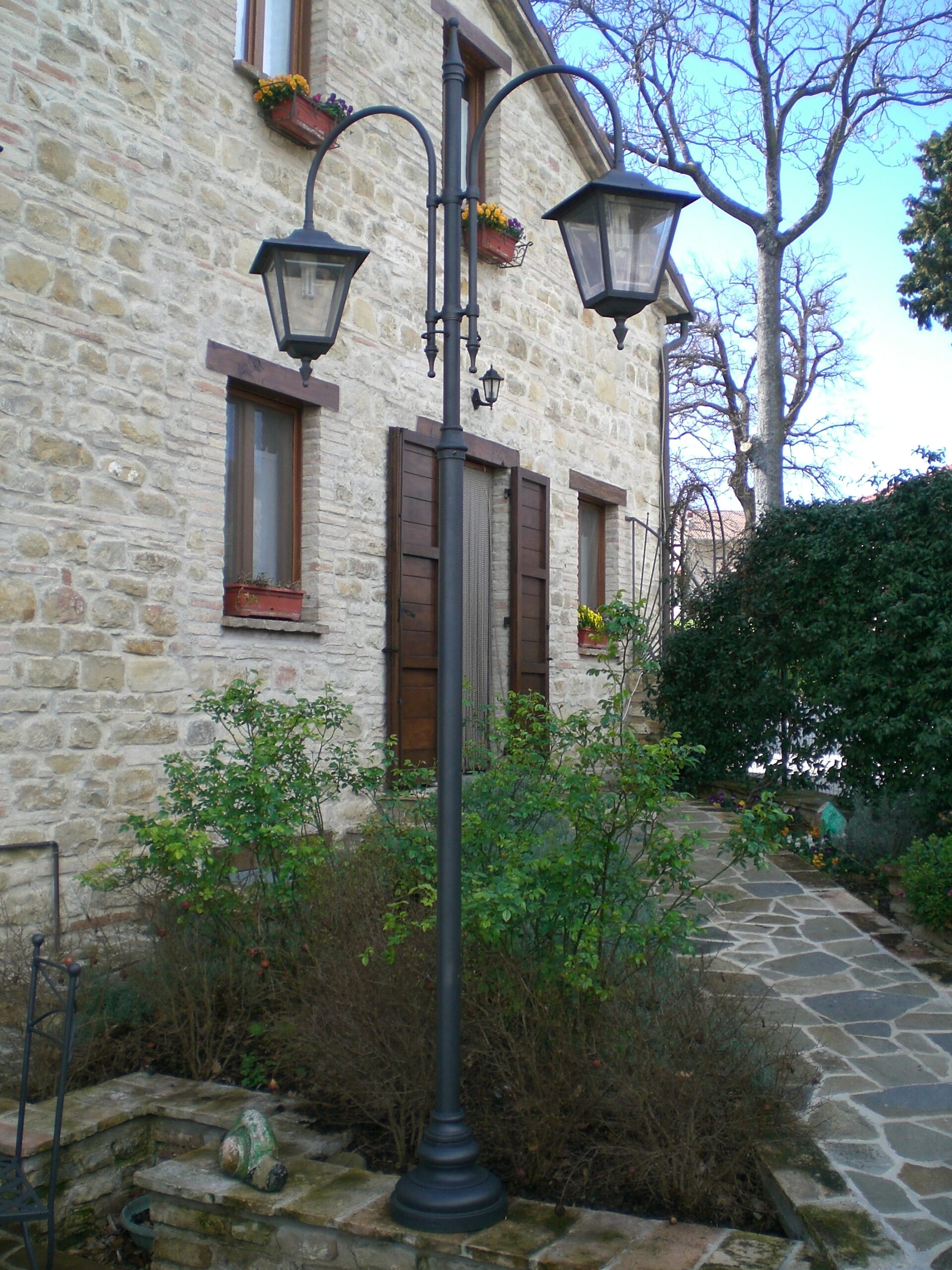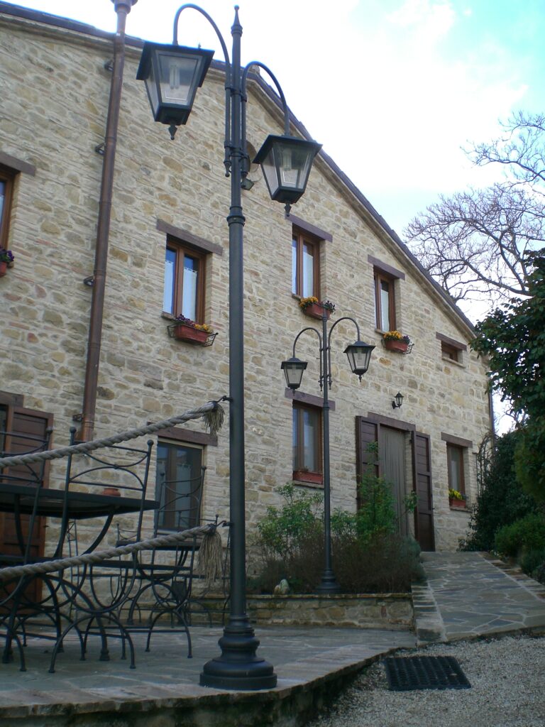 Anche per l’illuminazione abbiamo proposto i nostri lampioni con palo in acciaio e base decorativa in ghisa. Per la cima dei lampioni abbiamo scelto uno stile dalle linee pulite che ben si abbina allo stile dell’agriturismo ed il gruppo a 2 bracci modello Vietri con lanterne è risultato perfetto.