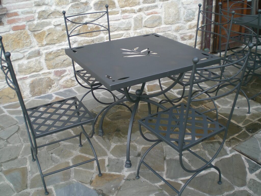 Le sedie ed i tavoli sono in ferro zincato e verniciato a polvere colore grigio antracite.
