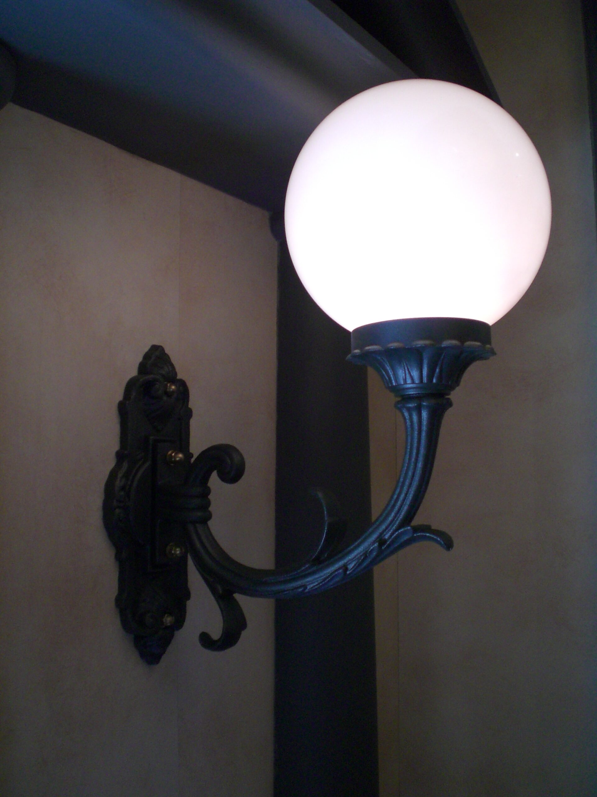 Abbiamo realizzato allestimento con tavoli e sedie in fusione d'alluminio modello Laura con bracciolo in colorazione antracite e applique a muro con globo.