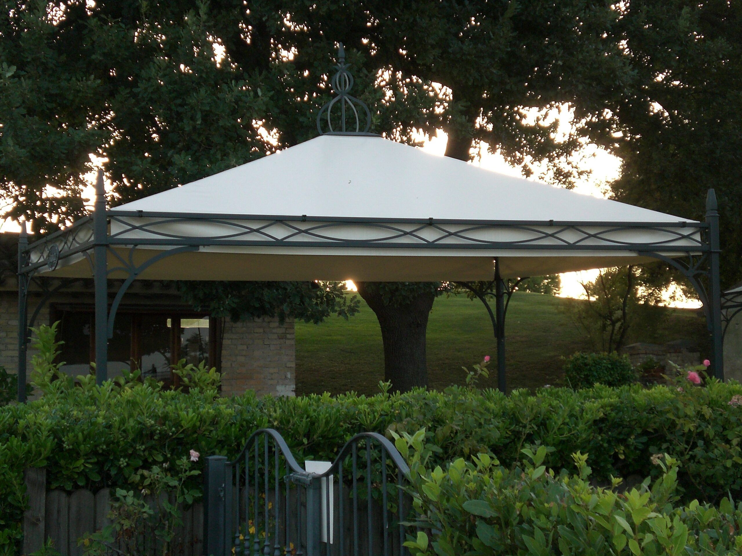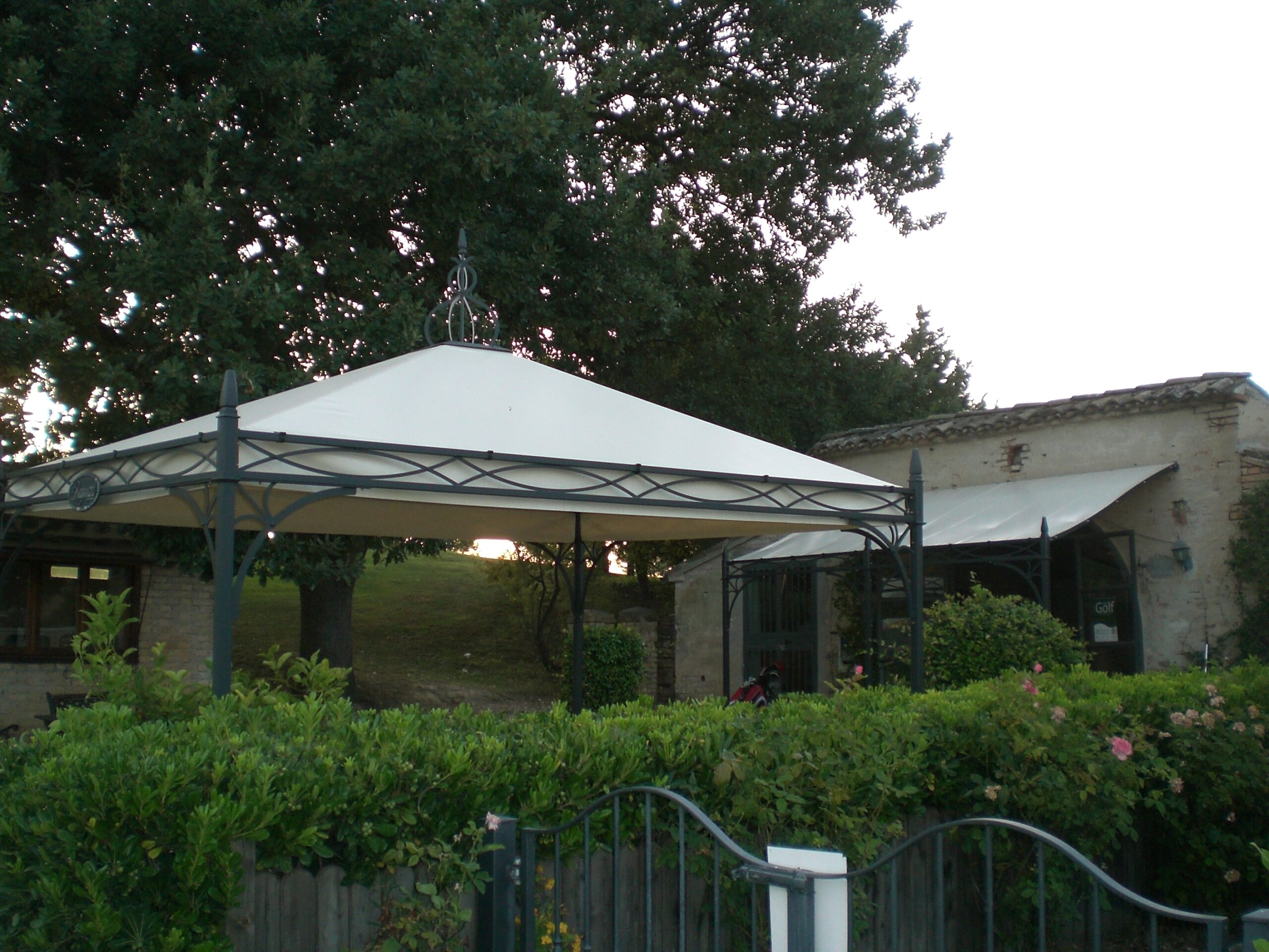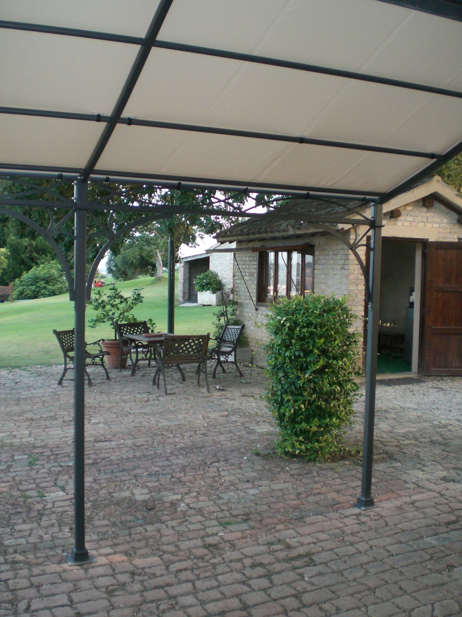Abbiamo realizzato le strutture in ferro forgiato, zincato e verniciato a polvere colore antracite. In entrambe le strutture il telo di copertura è in pvc champagne.
