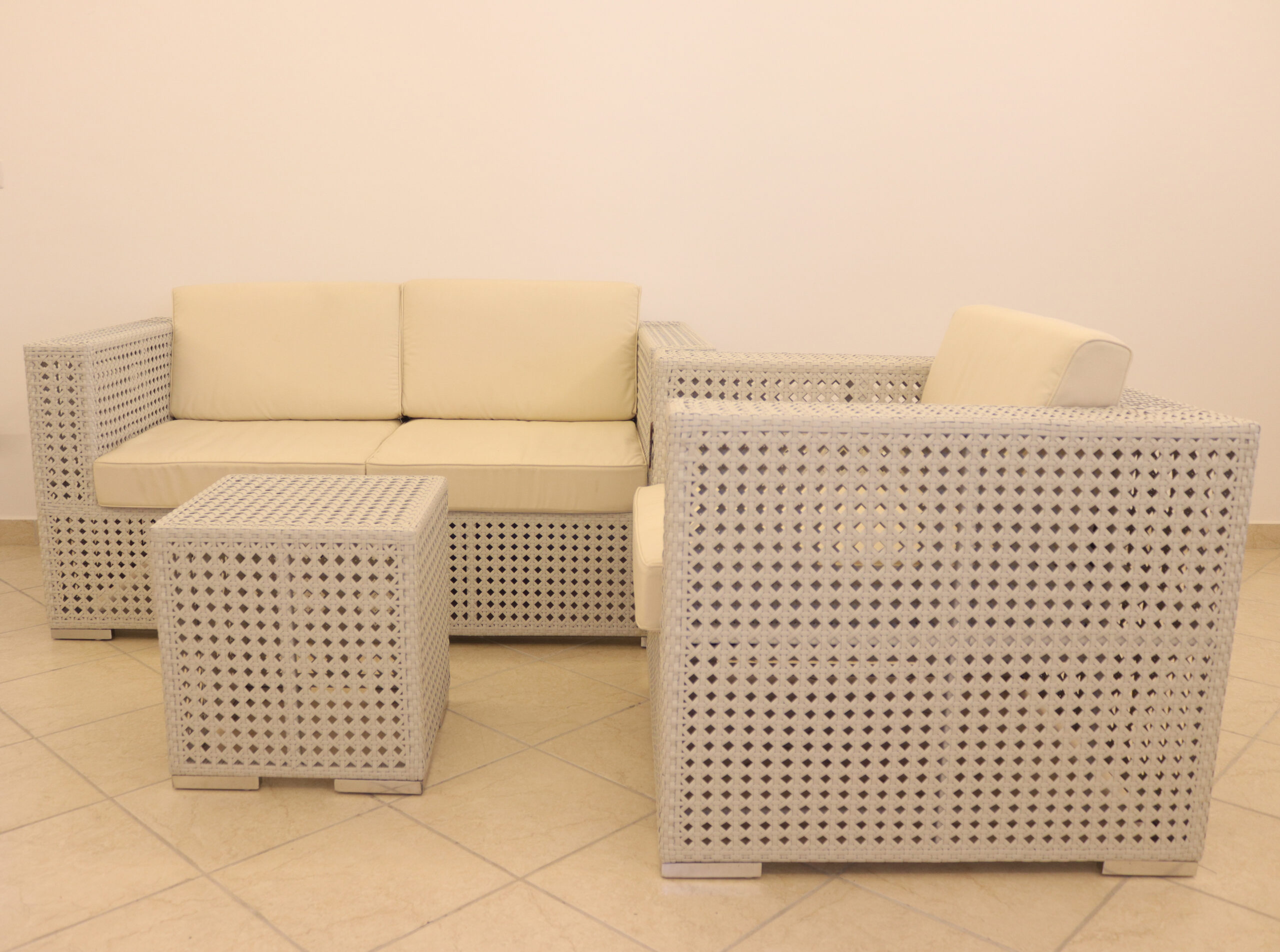 - Cuscineria e tettuccio in tessuto acrilico ecrù, inclusi