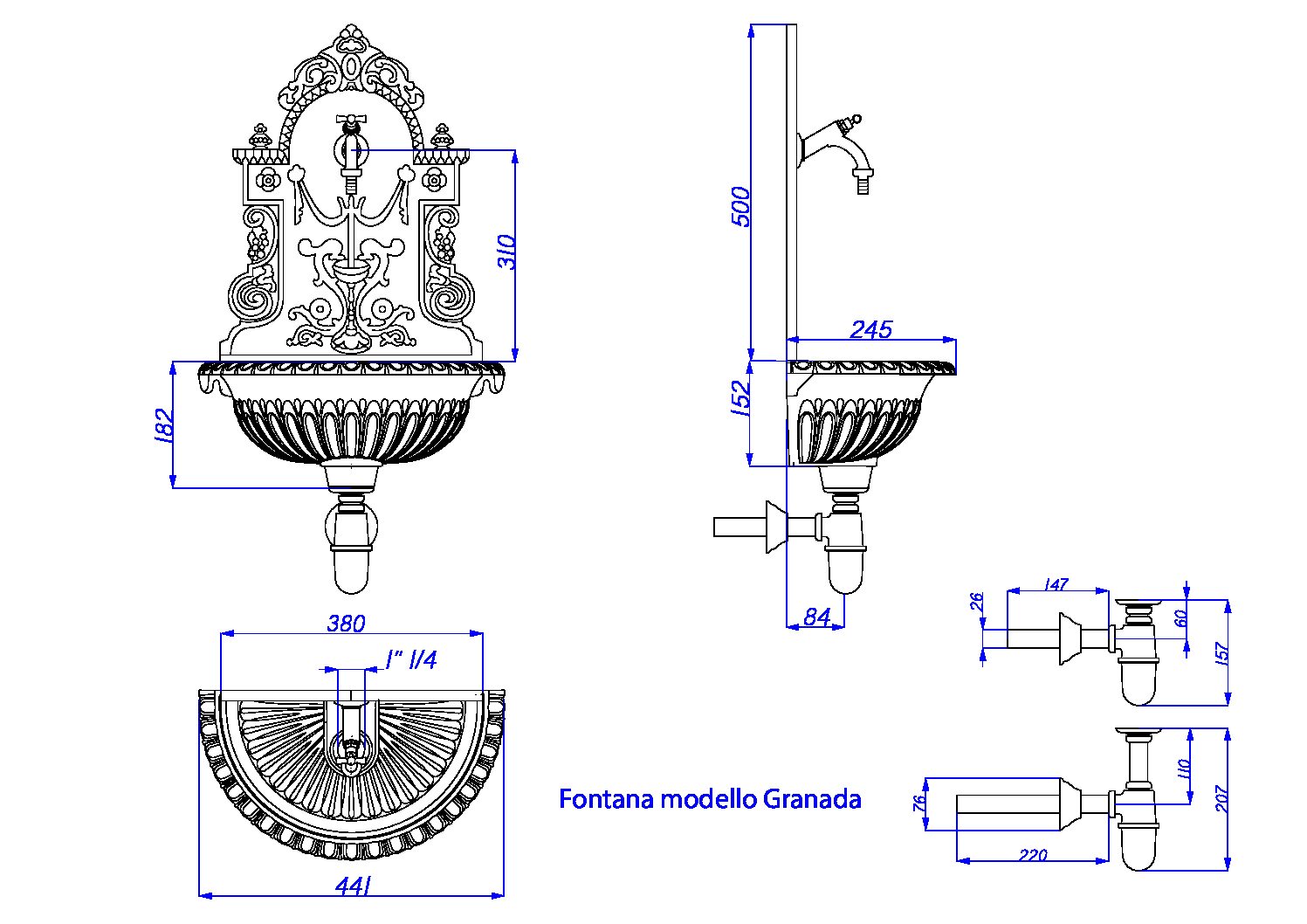 Fontana a muro Granada con rubinetto 147/C e sifone brunito