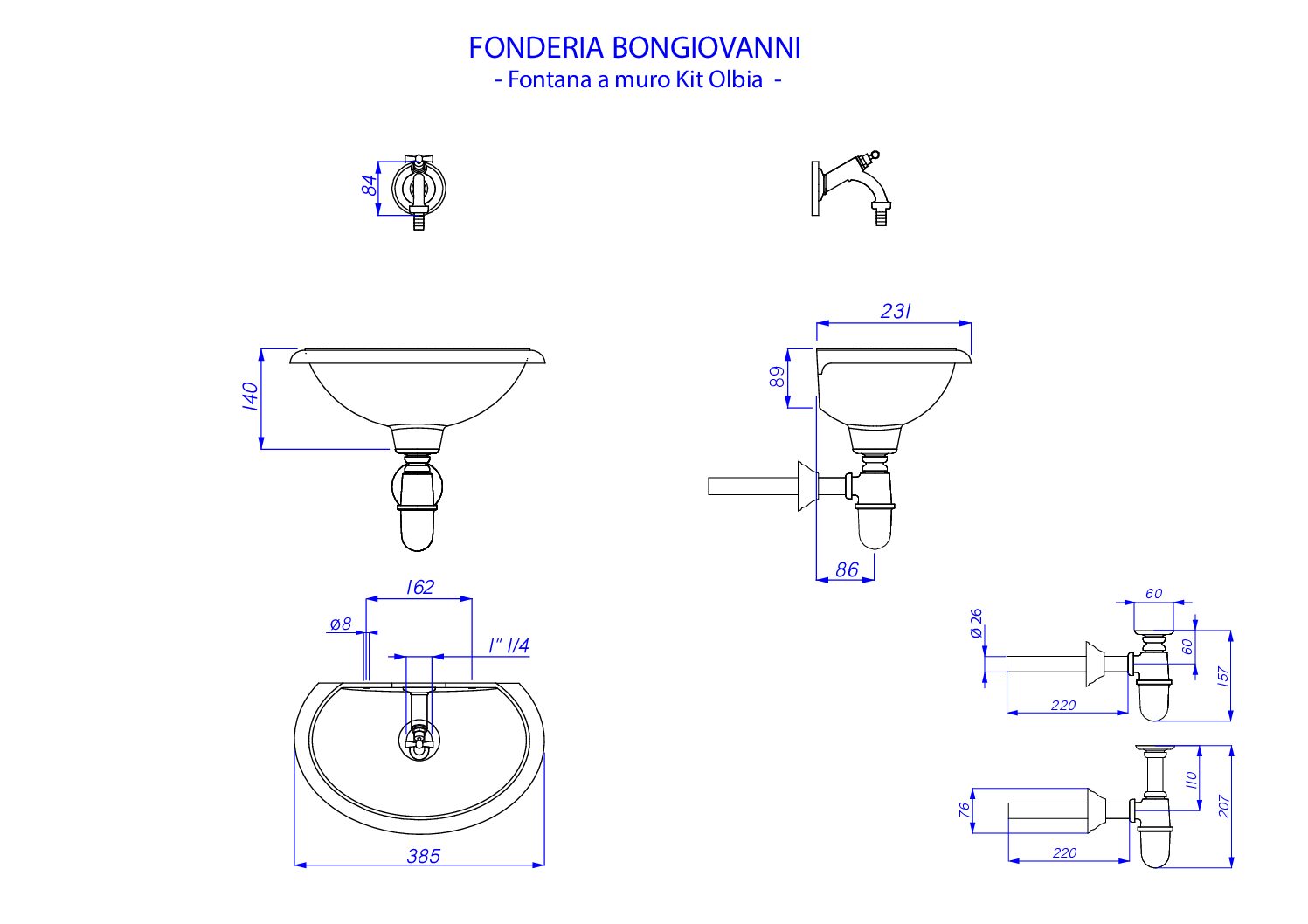 Fontana a muro mod. Olbia con rubinetto cod. 303 e sifone in ottone cromato