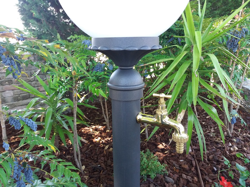 Fontana a colonna mod. Erice in acciaio zincato e verniciata a polvere epossidica color antracite, con rubinetto cod. 195 in ottone lucido completa di globo in acrilico di colore bianco diametro 25 cm.