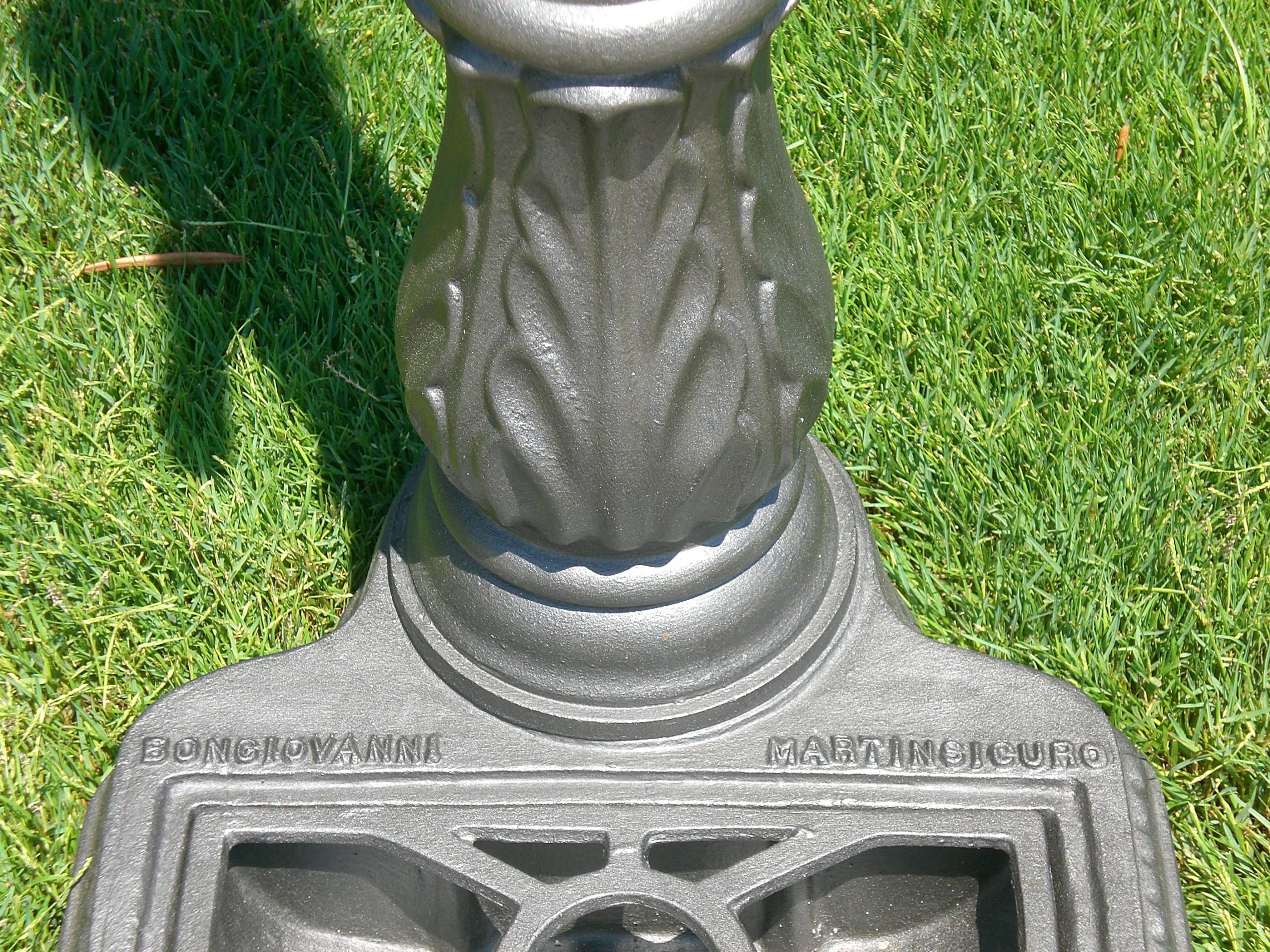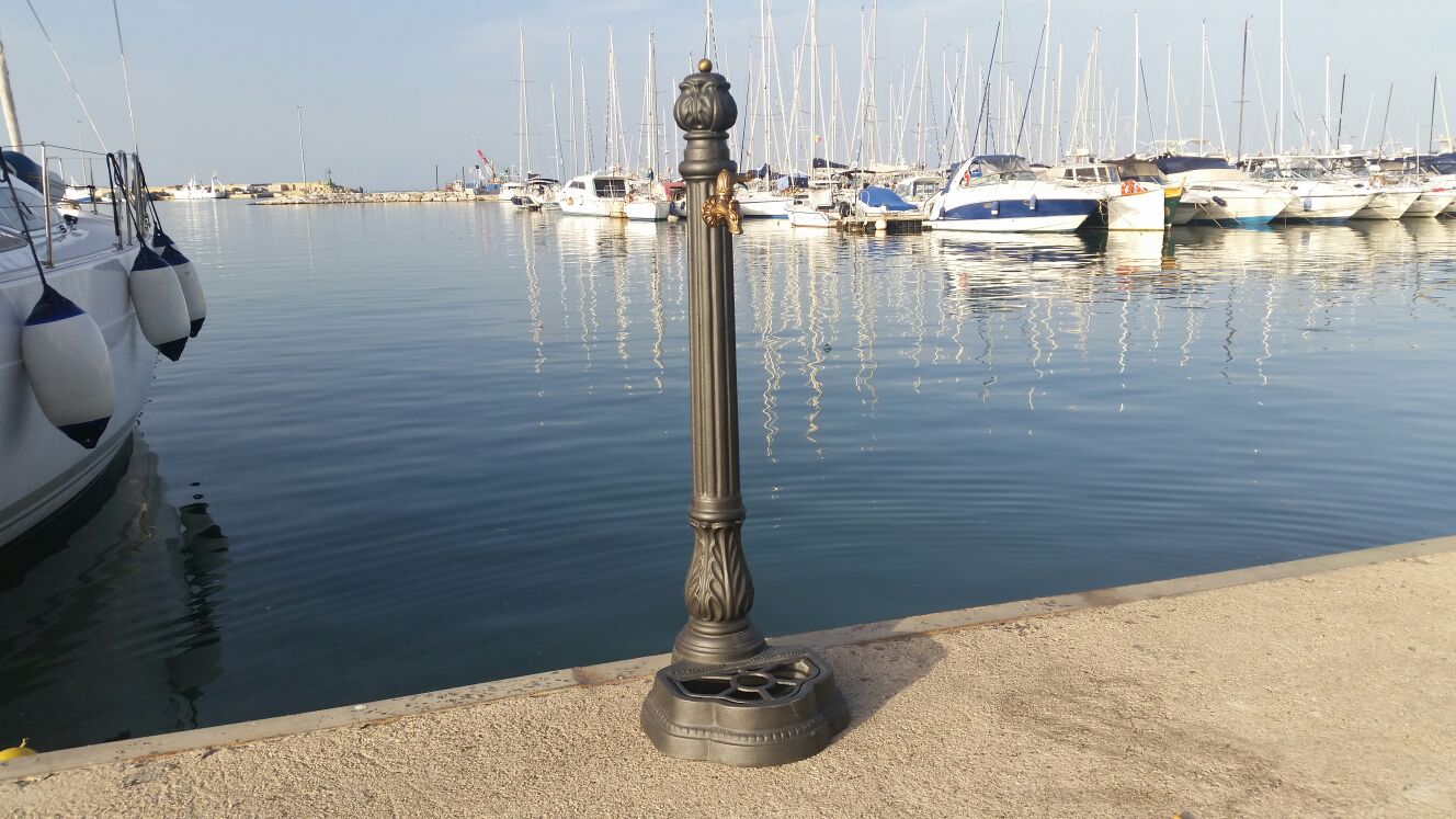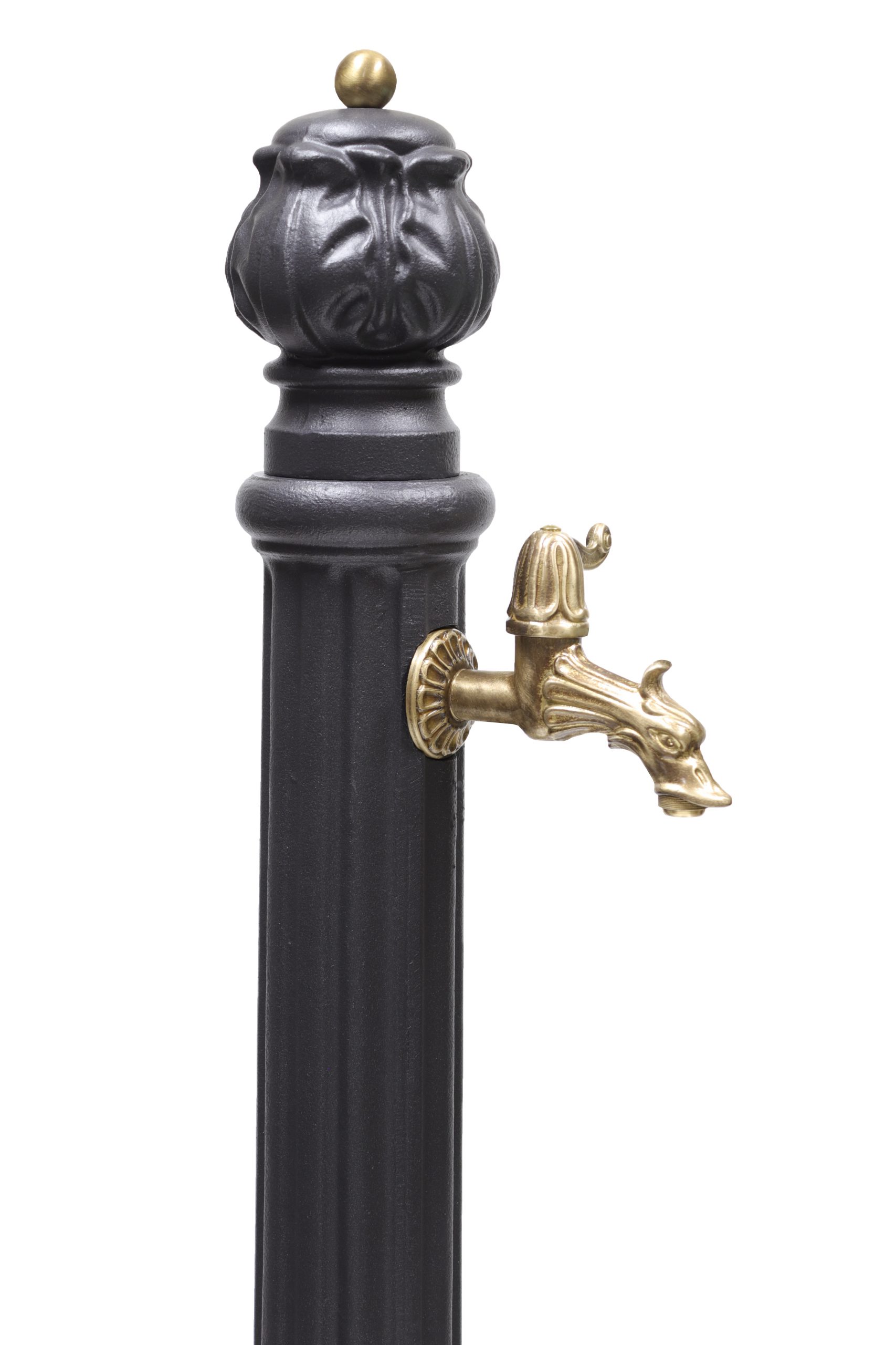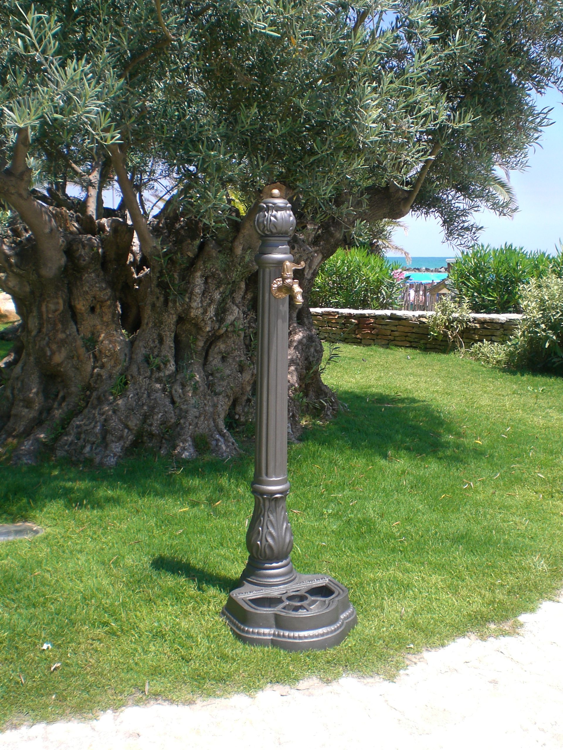 Fontana a colonna mod. Iside in ghisa verniciata a polvere epossidica color antracite con rubinetto cod. 147/C in ottone brunito completa di vasca alla base con griglia.