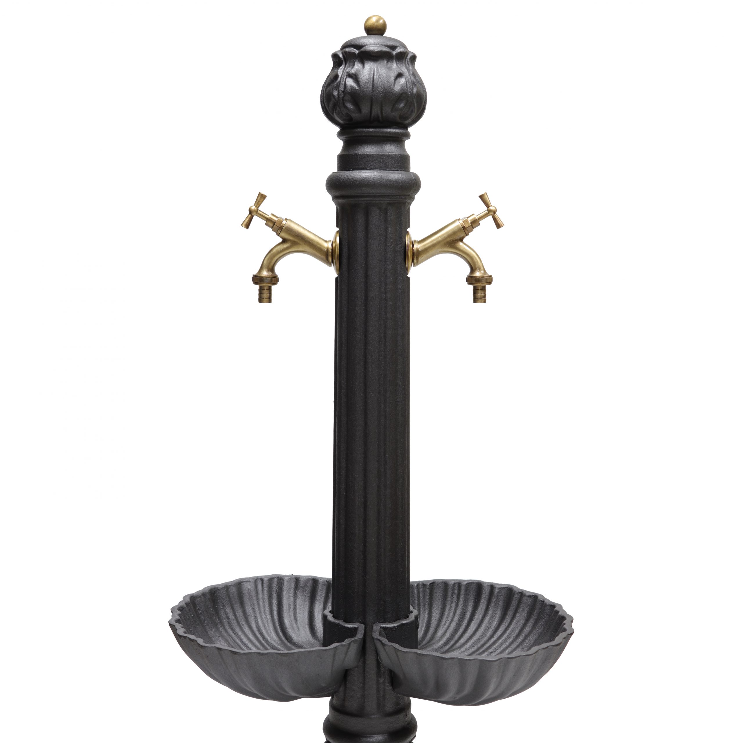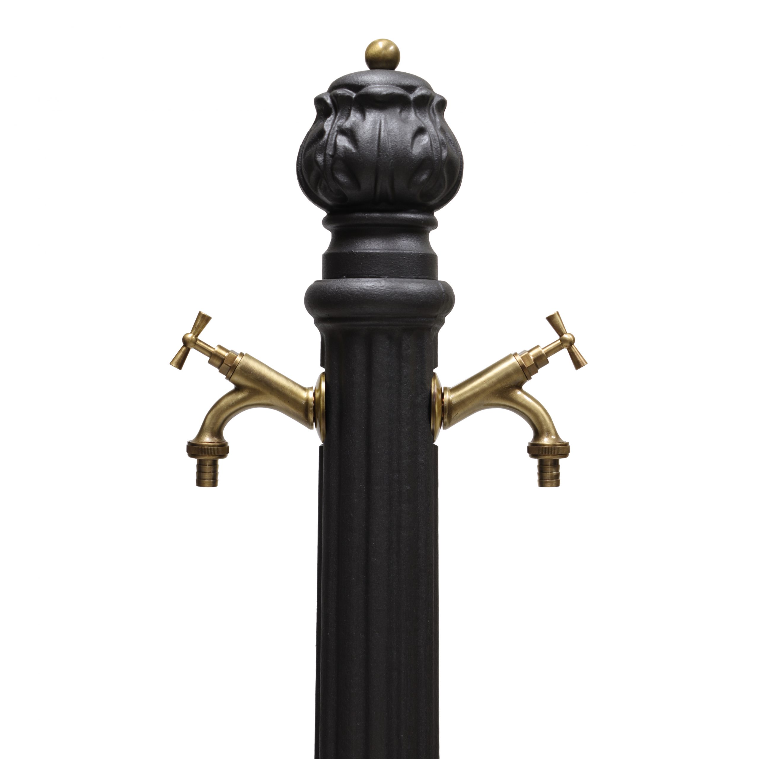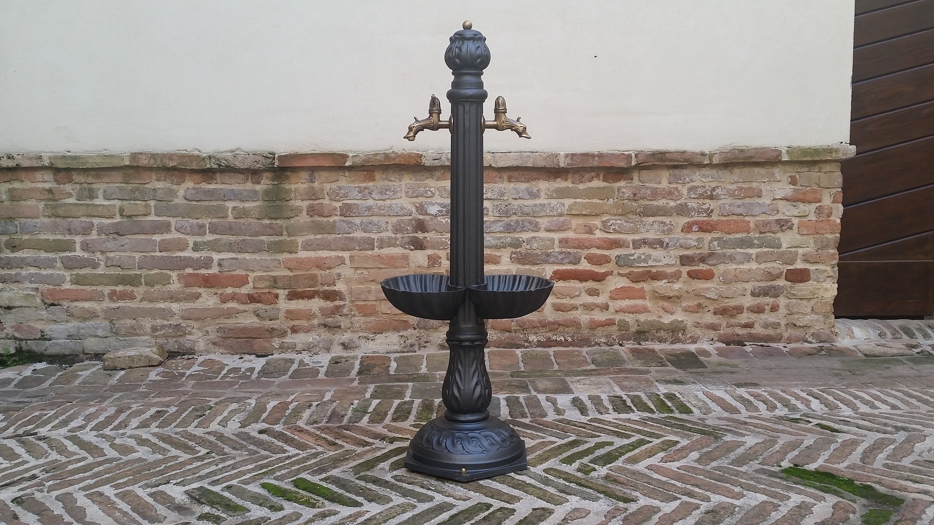 Fontana a colonna mod. Minerva in ghisa, verniciata a polvere epossidica color antracite, con due rubinetti cod. 303 in ottone brunito, completa di due vasche.
