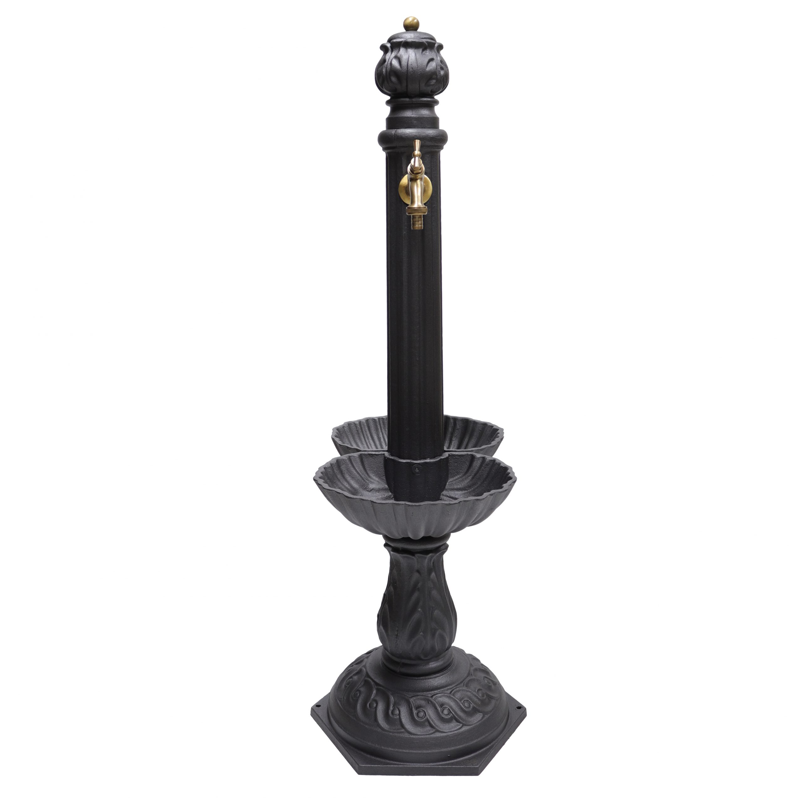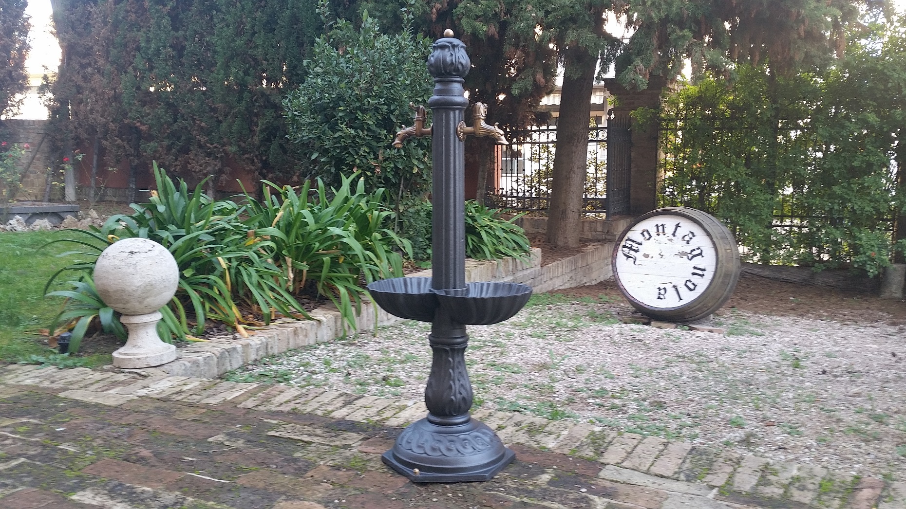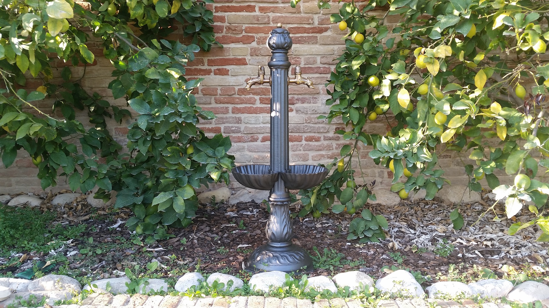 Fontana a colonna mod. Minerva in ghisa, verniciata a polvere epossidica color antracite, con due rubinetti cod. 303 in ottone brunito, completa di due vasche.