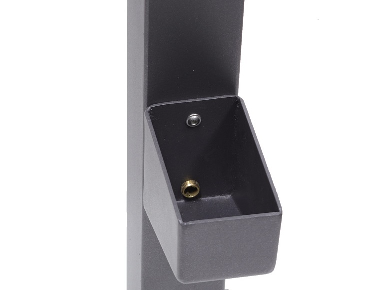 Fontana a colonna mod. Sparta realizzata in acciaio zincato e verniciato a polvere epossidica color grigio ghisa, con rubinetto cod. 303 in ottone lucido completa di base e vasca.