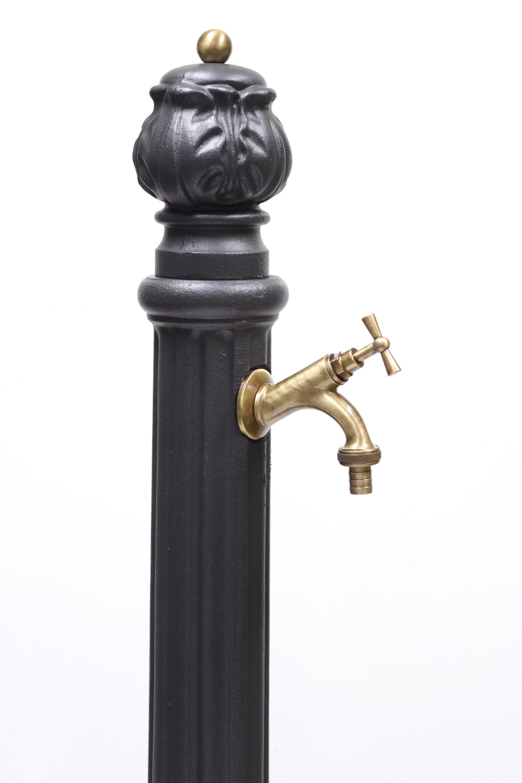 Fontana a colonna in ghisa verniciata a polvere epossidica color antracite arricchita da particolari in ottone, mod. Venere con rubinetto cod. 303 in ottone brunito completa di vasca.