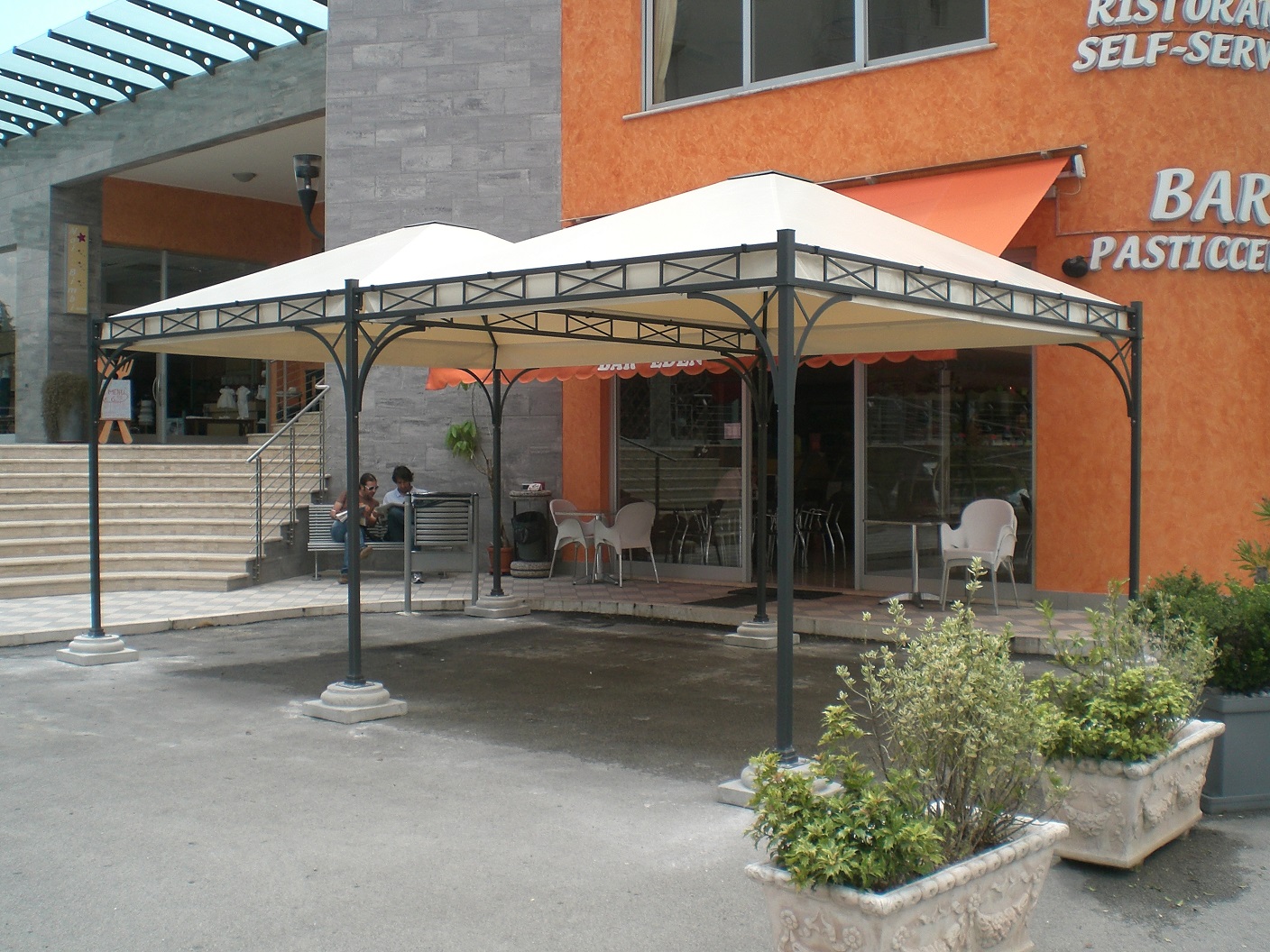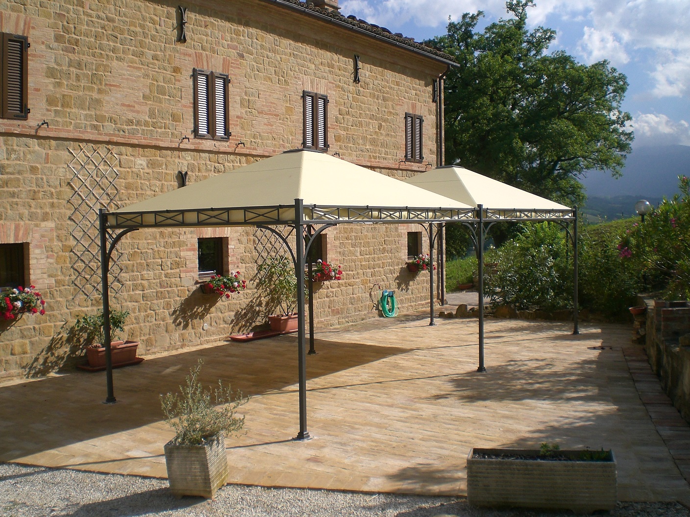 Armatura in ferro lavorato, zincato e verniciato a polvere epossidica colore standard antracite. Telo di copertura Pvc ignifugo disponibile in tinta unita colore champagne.