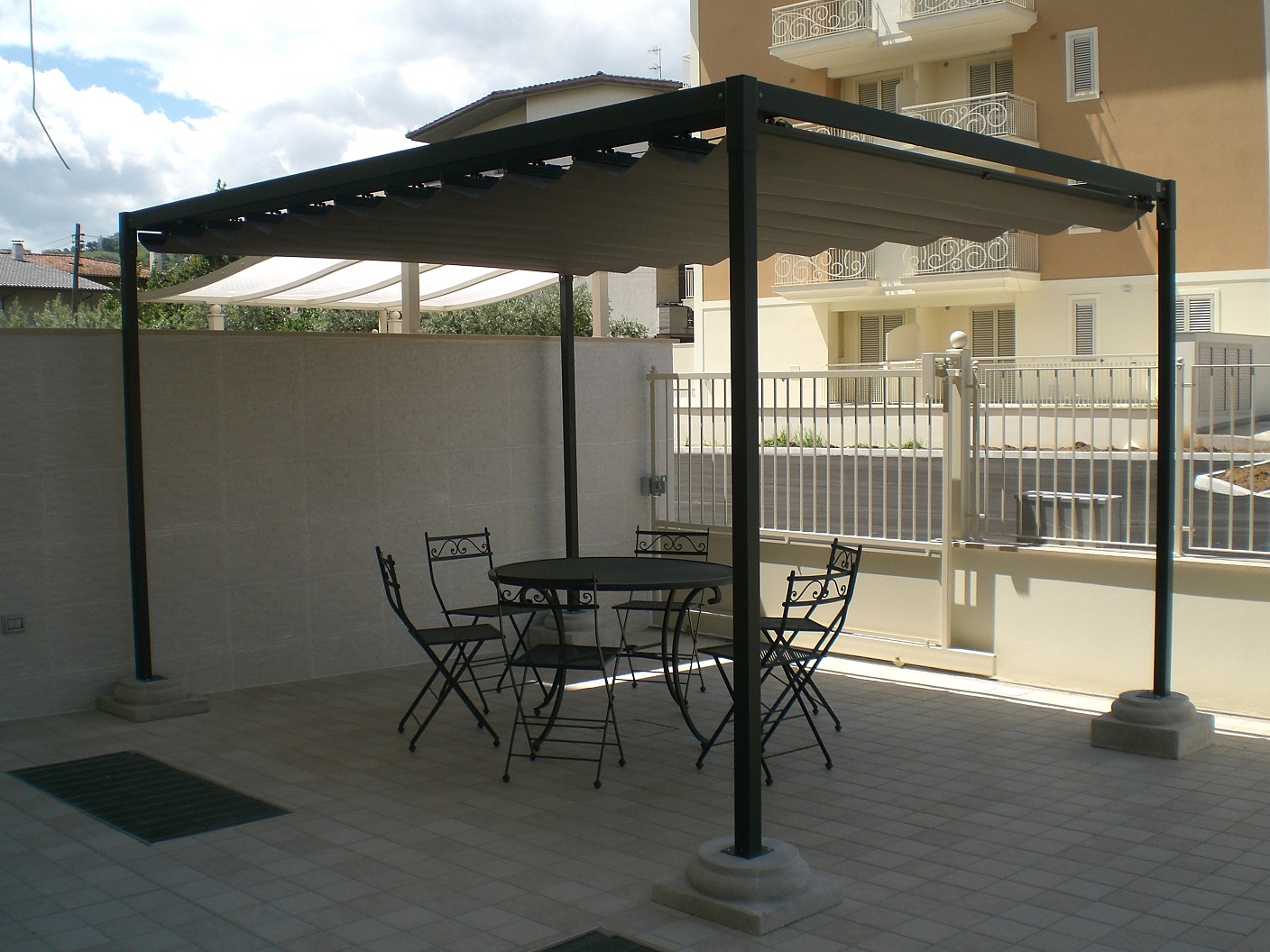 Gazebo realizzato in alluminio con trattamento di verniciatura epossidica a polvere colore antracite.