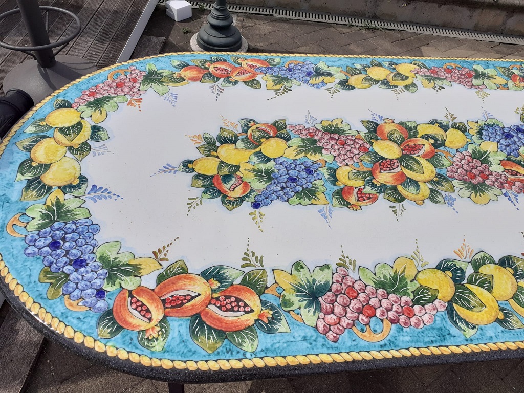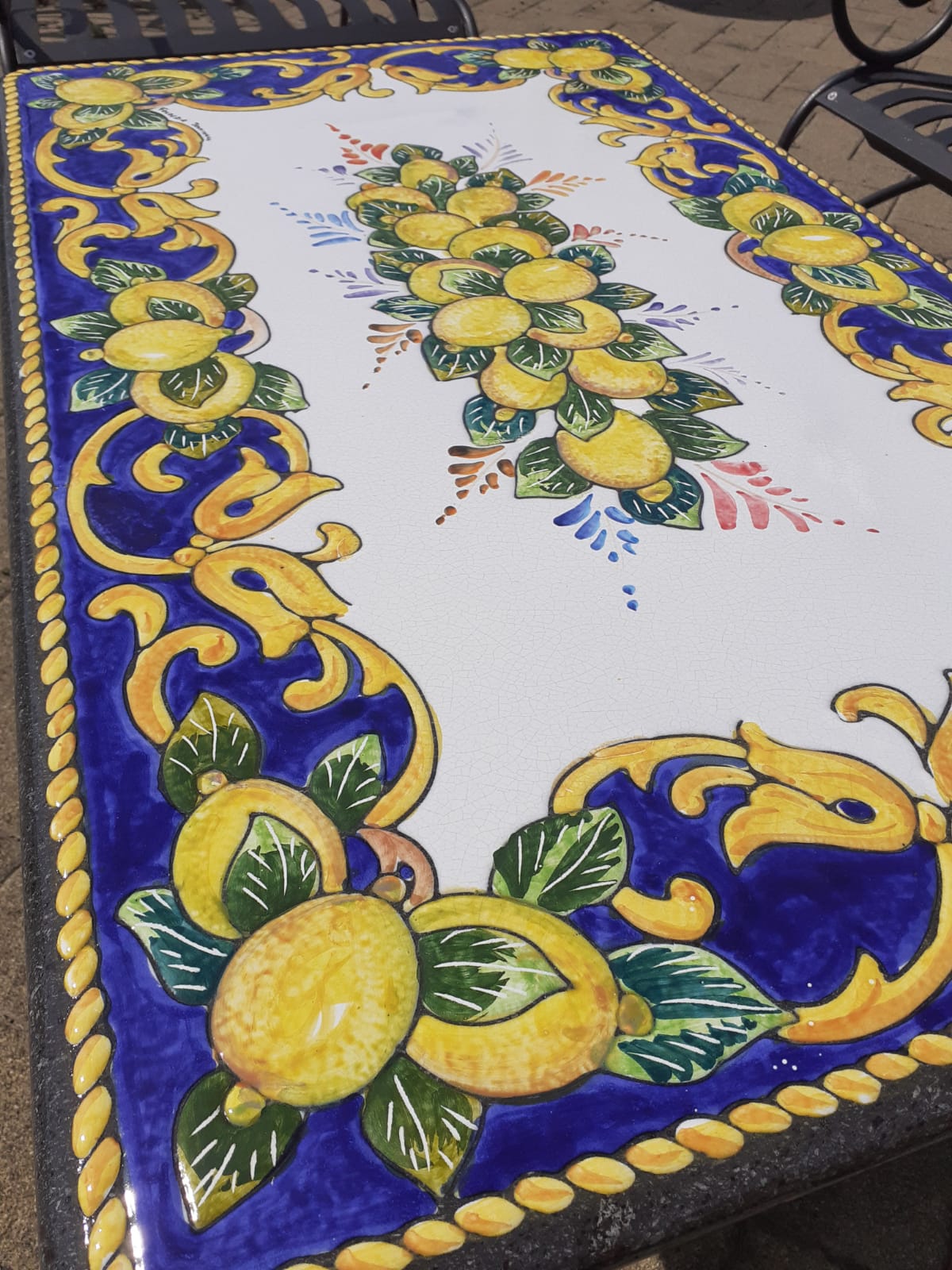 La lastra così ottenuta viene poi smaltata con particolari smalti, “dipinta a mano” e cotta a circa 1000°C. (processo chiamato ceramizzazione)
