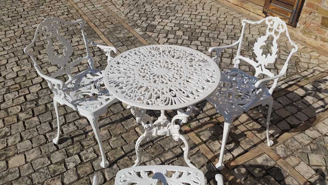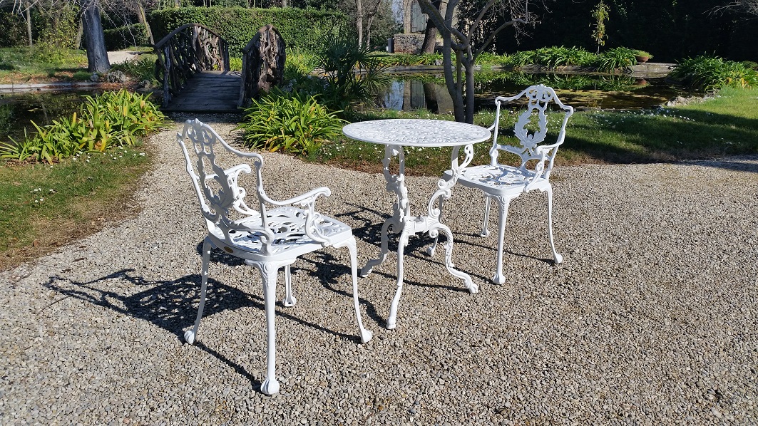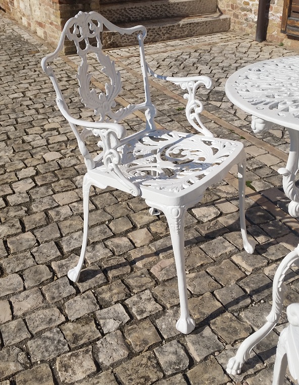 Poltrona Laura in fusione d’alluminio, con braccioli.