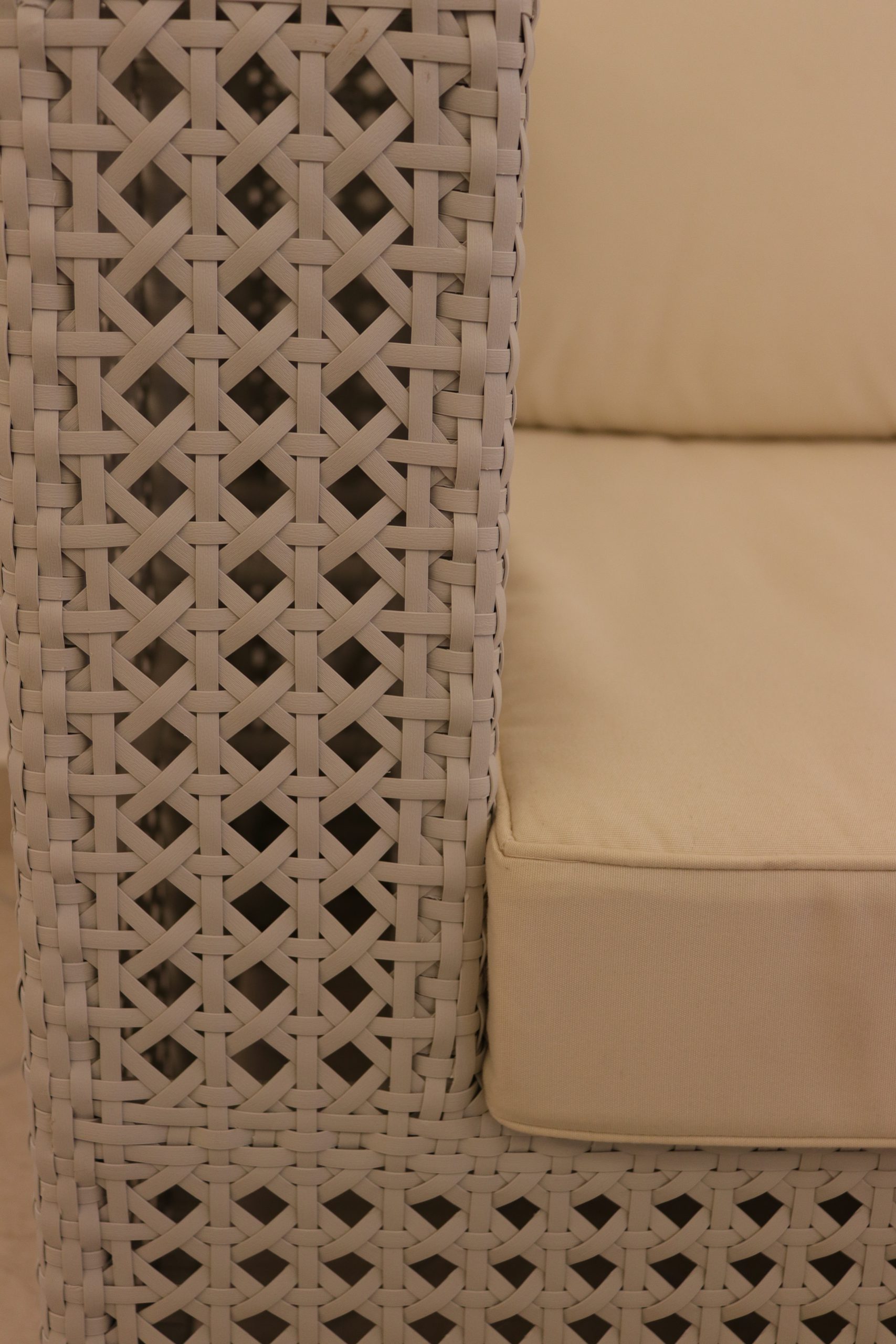 Struttura in alluminio e rivestimento in fibra sintetica colore ghiaccio, 2 cuscini per seduta colore ecrù, 2 poggia-schiena ecrù sfoderabili.