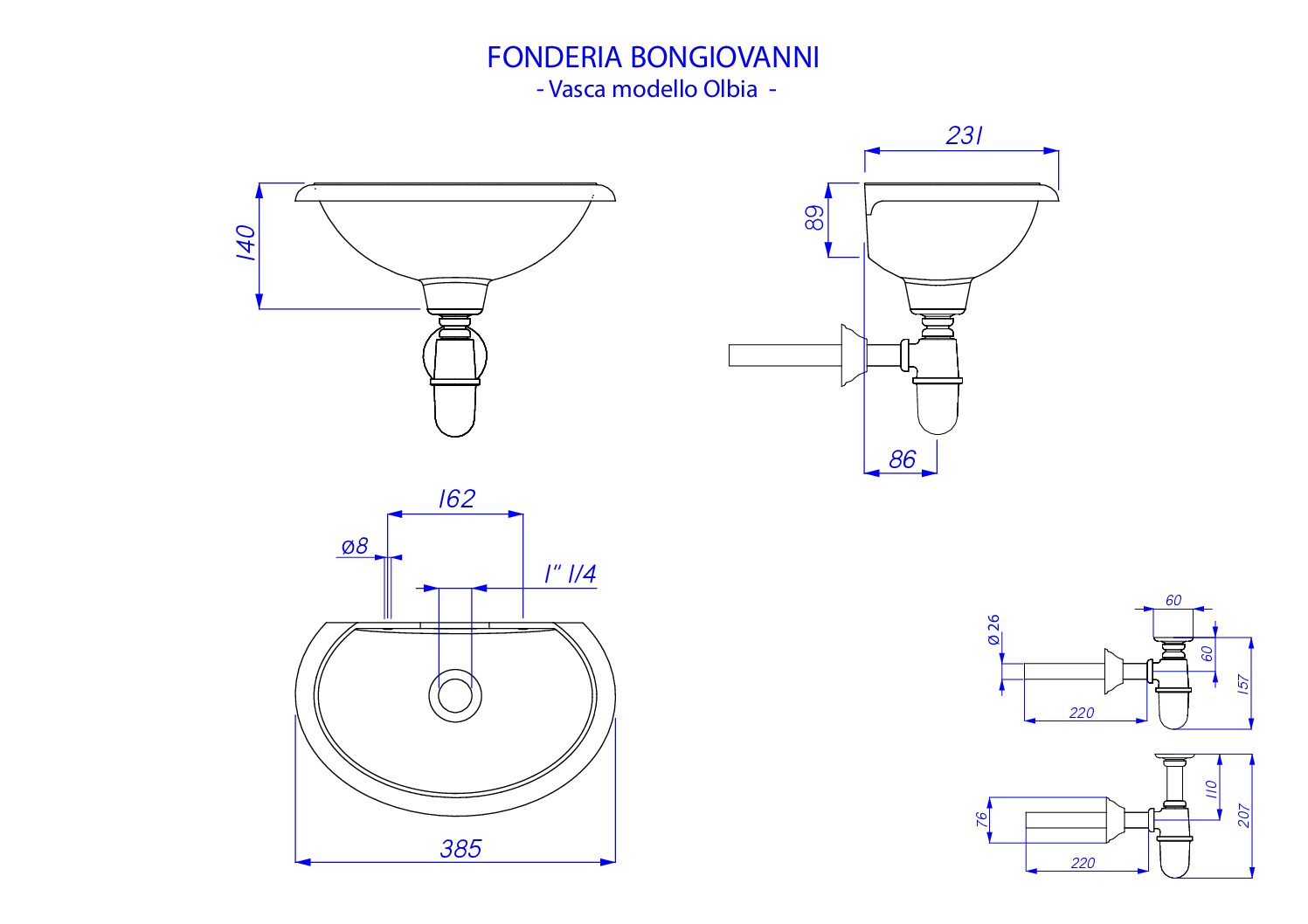 Vasca a muro mod. Olbia con sifone con piletta in ottone cromato